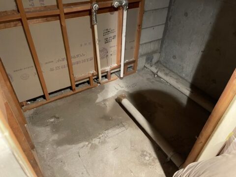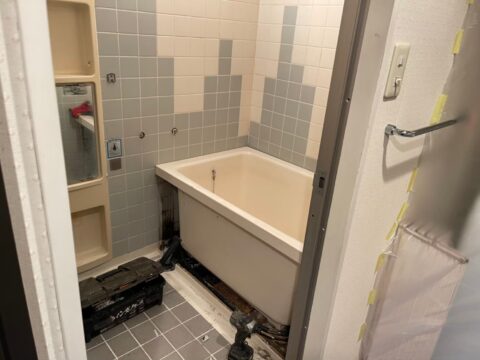 マンションに設置されている、ユニットバスの改修工事になります。古くなったユニットバスを、新しいユニットバスに交換する為、解体していきます。
