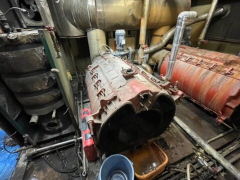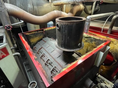 室内の解体後、お湯を沸かす大型のボイラーを解体します。重量物の為、出来るだけ小さくしていきます。