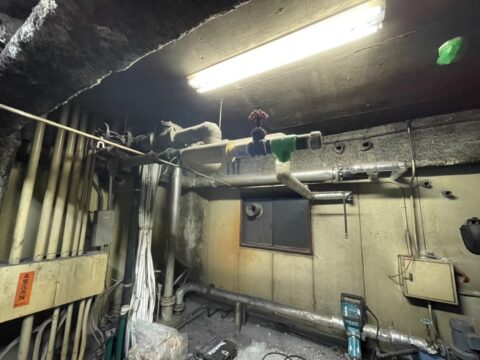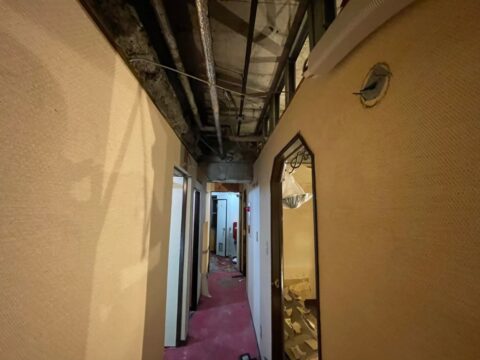 壁面に残ったダンゴも、電動ハンマ等を使い、綺麗に削ぎ落とします。天井等の配管等も撤去します。